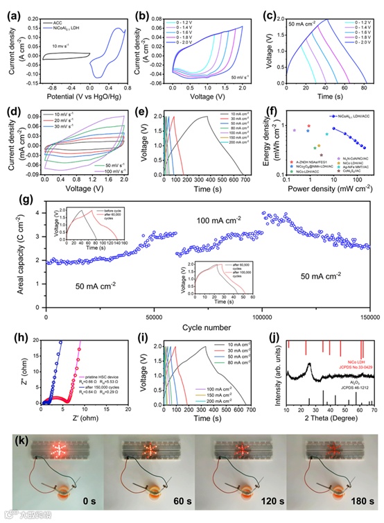 图 7. NiCoAl0.1LDH//ACC器件的电化学性能。(a) NiCoAl0.1LDH和ACC电极在10 mV·s−1下的CV曲线; (b) 器件在不同电压窗口下50 mV·s−1时的CV曲线; (c) 器件在不同电压窗口下50 mA·cm−2时的充放电曲线; (d) 器件在不同扫描速率时的CV曲线; (e) 器件在不同电流密度时的充/放电曲线; (f) 器件的Ragone图;(g) 器件的循环稳定性测试图; (h) 器件在循环测试前后的阻抗谱; (f) 循环测试后器件在不同电流密度下的充放电曲线; (j) NiCoAl0.1LDH在循环测试后的XRD谱; (k) 器件点亮LED灯的照片。