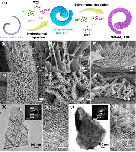 图1. a) 在CC衬底上生长的NiCoAl LDH结构的两步合成路线示意图。b–d) NiCo LDH 和 e–g) NiCoAl0.1LDH第二步溶剂热沉积后纳米阵列的 SEM 图像。NiCo LDH 的 h)TEM 和 i) HRTEM 图像。NiCoAl0.1LDH的j) TEM 和 k) HRTEM 图像。插图是相应的 SAED 图案。