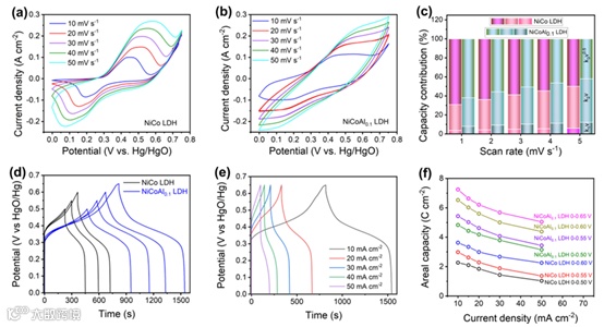 图3. NiCo LDH和NiCoAl0.1LDH电极的电化学性能。a)NiCo LDH和b)NiCoAl0.1LDH在不同扫描速率下的CV曲线。c) 不同扫描速率下的扩散和电容贡献。d) 两个电极在不同电压窗口下在10mA cm-2时的充电/放电曲线。e) NiCoAl0.1LDH电极在0–0.65 V电位窗口下不同电流密度下的充电/放电曲线。f) 两个电极在不同电位窗口下的倍率性能。