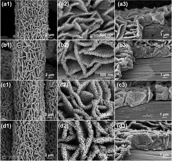 图5. 不同循环次数下NiCoAl0.1LDH电极的形貌变化:(a)10,000次循环后;(b) 20,000次循环后;(c) 30,000次循环后;以及(d)40,000次循环后。