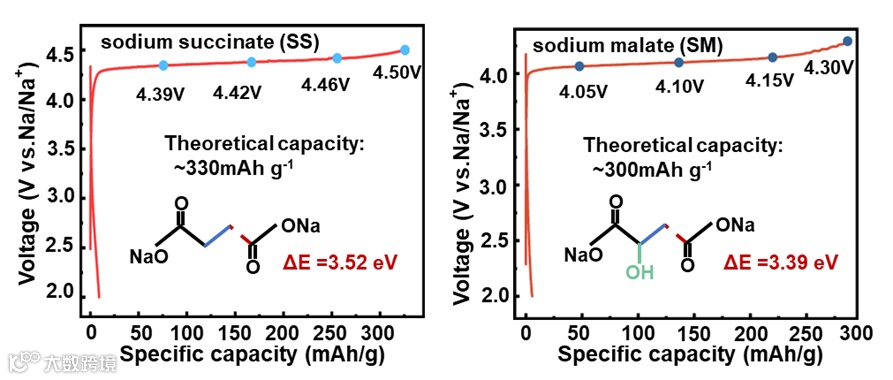 通过DFT计算C-C键解离能的变化趋势,与顺丁烯二酸二钠对比,将双键还原后其解离能降低了0.2eV,进一步引入羟基后下降了0.33eV,预示着琥珀酸钠与苹果酸钠的羧酸钠基团更易解离。琥珀酸钠的理论容量为330mAh/g,通过CV曲线发现琥珀酸钠的分解电压下降了0.31V,并且在4.5V完全分解,提供316.7 mAh/g的不可逆容量,利用率提升至97%。苹果酸钠理论容量为300 mAh/g,其分解电压进一步下降至3.85V。根据XRD谱图推断其在4.30V完全分解,提供283.9 mAh/g的不可逆容量,利用率为96%。二者性能相较于顺丁烯二酸二钠都有极高的提升。