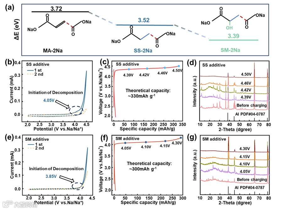 图2. (a)C-C键解离能变化趋势;琥珀酸钠的(b)CV曲线;(c)首圈充放电曲线;(d)不同截止电压对应的XRD图谱;苹果酸钠的(e)CV曲线;(f)首圈充放电曲线(g)不同截止电压对应的XRD图谱