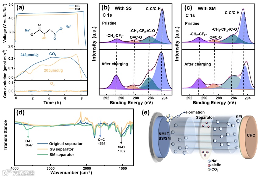 图3. (a)琥珀酸钠与苹果酸钠的DEMS图谱;(b)琥珀酸钠循环前后C 1S 高分辨谱图;(c)苹果酸钠循环前后C 1S 高分辨谱图(d)不同隔膜的红外光谱对比(e)琥珀酸钠与苹果酸钠的分解示意图