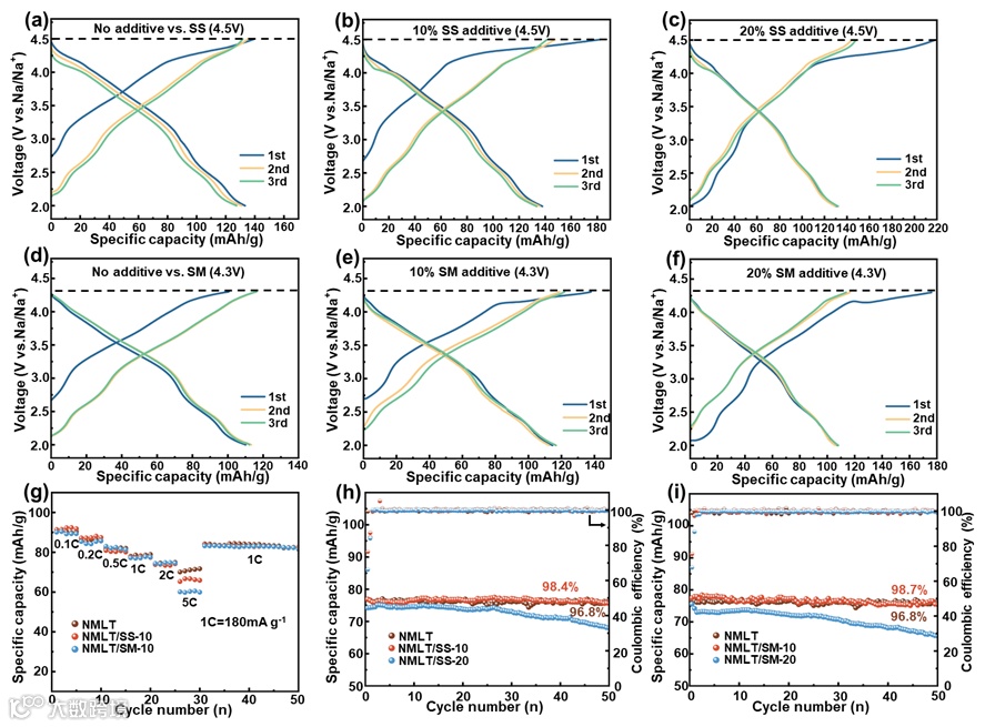 图4. (a)(b)(c)未添加与添加(10 wt%/20 wt%)SS 添加剂的半电池电化学性能比较;(d)(e)(f) 未添加与添加(10 wt%/20 wt%)SM 添加剂的半电池电化学性能比较;(g) NMLT、NMLT/SS-10 和 NMLT/SM-10 电极的倍率性能。(h) NMLT、NMLT/SS-10 和 NMLT/SS-20 电极的循环性能。(i) NMLT、NMLT/SM-10 和 NMLT/SM-20 电极的循环性能。