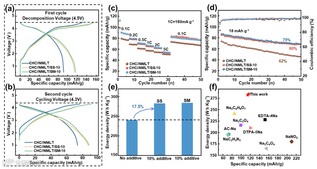 图5. 未添加与添加10 wt%SS/SM的全电池性能比较 (a) 0.5V-4.5V首圈充放电曲线;(b)1V-4.3V首圈充放电曲线;(c)倍率性能对比;(d)不循环性能对比(e)能量密度对比(基于正负极活性物质质量);(f)添加不同补钠剂全电池的能量密度与可逆容量对比