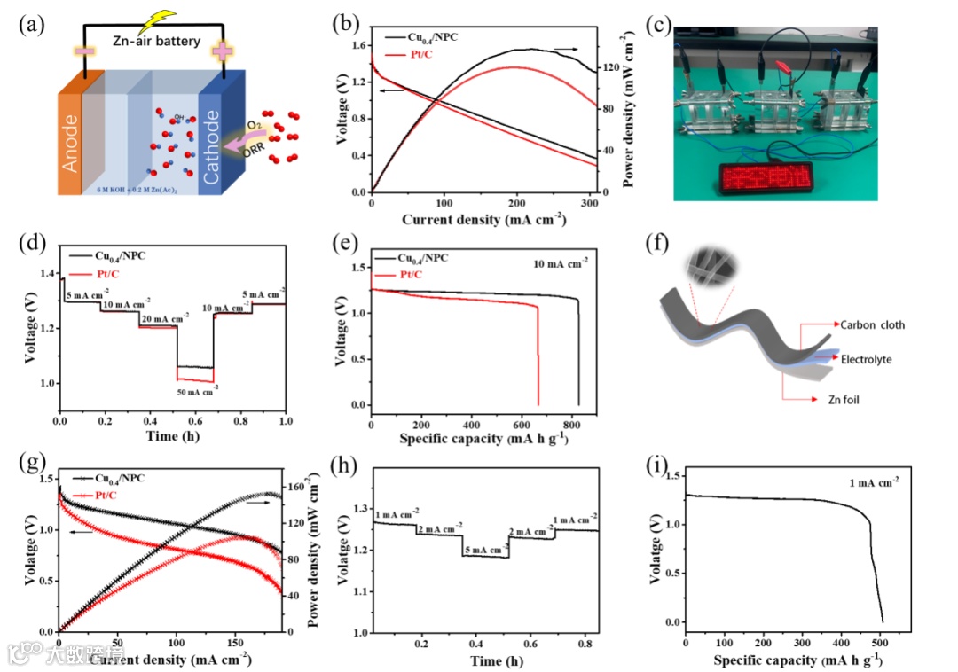 Cu0.4/NPC组装的液态锌空气电池的开路电压约为1.53 V,峰值功率密度可以达到 142 mW cm-2,比容量可达到 829 mA h g-1。此外,当Cu0.4/NPC组装的锌空气电池以不同的电流密度放电(从 5 到 50 mA cm-2)时,放电曲线表明Cu0.4/NPC基电池具有优异的ORR稳定性和倍率性能。基于Cu0.4/NPC在液态锌空气电池中的优异性能以及在柔性储能产品的需求背景下,作者进行了柔性锌空气电池的组装。用Cu0.4/NPC作为空气阴极组装的固态锌空气电池的开路电压为1.39 V,峰值功率密度达到 157 mW cm-2。以上结果证明了Cu0.4/NPC催化剂在锌空气电池中的良好的应用前景。
