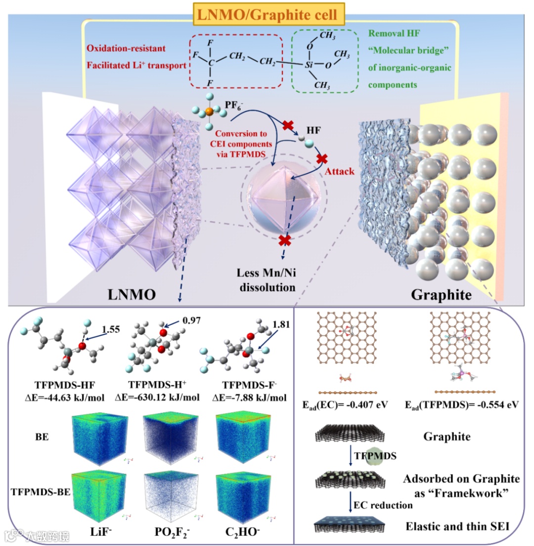 图 1. TFPMDS对改善LiNi0.5Mn1.5O4//石墨电池循环性能的作用示意图。