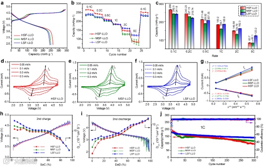具有低缺陷浓度的富锂锰基层状氧化物(LSF-LLO)具有更优异的倍率性能,而且在超过1C的倍率下具有更高的容量。电化学扩散动力学分析证实了LSF-LLO具有更优异的锂离子扩散能力。300周循环后,LSF-LLO同样也展现出更高的循环稳定性。