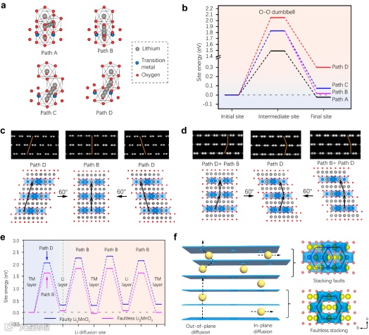 富锂锰基层状氧化物(LLO),因其具有超高容量(约270 mAh/g),被认为是未来锂离子电池中最有潜力的正极材料之一。在结构上,LLO呈现蜂窝状超结构,其中过渡金属(TM)层存在额外的Li位点。这种结构理论上允许Li离子不仅在Li层内以两个维度迁移,还可在TM层中以三个维度迁移。事实上,LLO中存在大量本征的堆垛层错缺陷,这些晶体缺陷是晶体生长过程中形成的。然而,研究表明,LLO中Li离子的实际扩散动力学较慢,导致了其倍率特性不足,严重限制了该材料的应用。鉴于LLO中存在大量作为晶体缺陷的堆垛层错,其对锂扩散动力学的影响值得进一步研究。