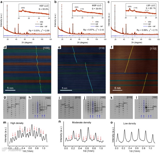 通过共沉淀法,并控制锂盐的投量,制备出三种(HSF-LLO,MSF-LLO,LSF-LLO)具有不同堆垛层错浓度的单晶样品。通过FUALTS拟合,三个样品中堆垛层错浓度分别为55.8%(HSF-LLO)、39.6%(MSF-LLO)和28.1%(LSF-LLO)。HAADF-STEM和电子衍射表征证明了堆垛层错和相应的浓度差异的存在(图1)。