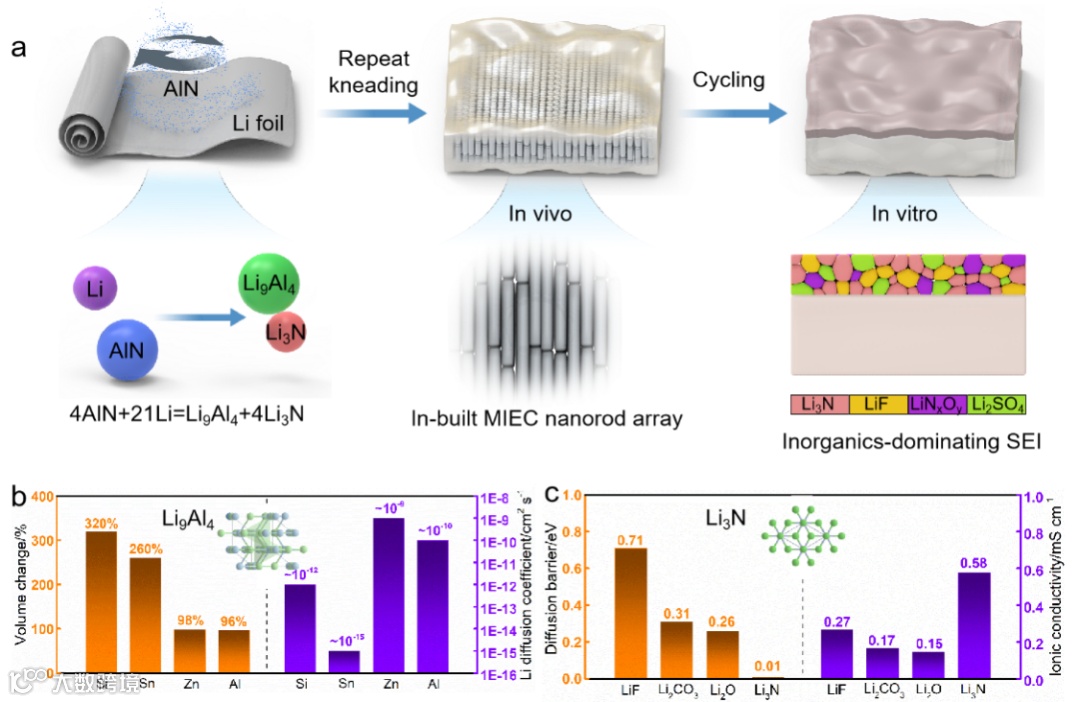图2. 复合负极K-Li@AlN的设计指导:a) K-Li@AlN制造工艺示意图。通过定向折叠和重复揉捻形成纳米棒阵列结构。b) 各种锂金属合金的体积变化和Li+传输性能对比。c) 各种含Li无机化合物的扩散势垒和离子电导率对比。