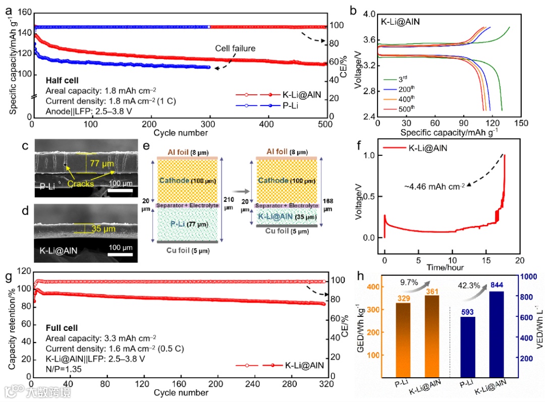 图6. K-Li@AlN的电化学性能。a) 1 C时P-Li ||LFP和K-Li@AlN||LFP半电池的循环性能。b) K-Li@AlN||LFP半电池不同周期对应的充放电曲线。制备的c) 77 μm P-Li和d) 35 μm K-Li@AlN箔的截面SEM图像。e)采用P-Li或K-Li@AlN负极的全电池所有组件的堆叠尺寸示意图。f) 35 μm K-Li@AlN箔的电压-时间分布,电压上限为1.0 V。g) K-Li@AlN||LFP全电池在0.5 C下的循环性能。h) P-Li ||LFP和K-Li@AlN||LFP全电池的GED和VED差异。