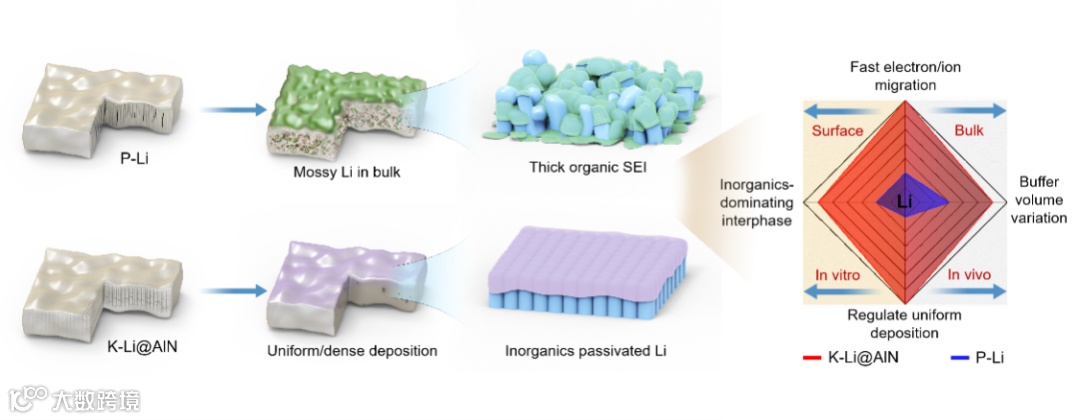 图1. P-Li和K-Li@AlN的表面/体相演化行为示意图
