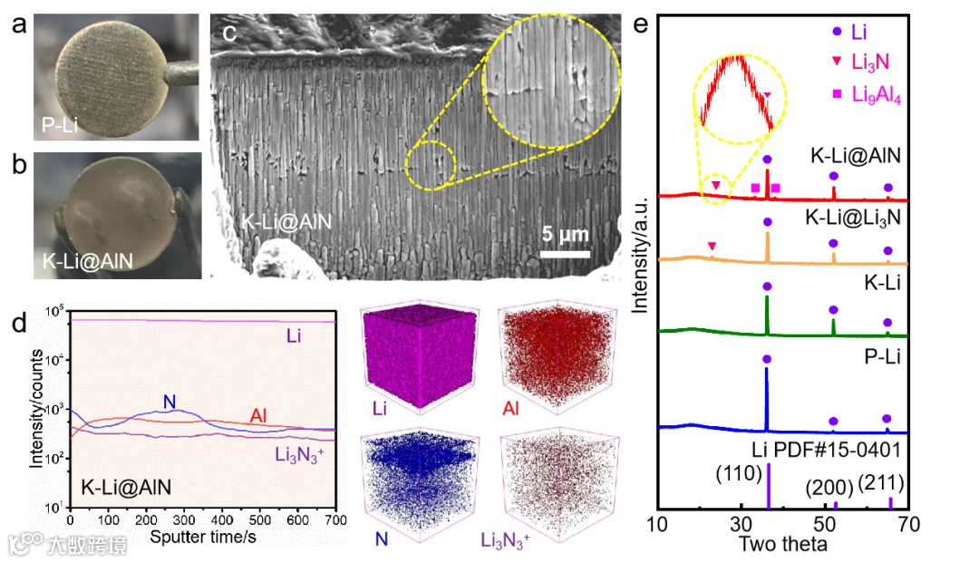 图3. 锂金属负极的物理化学表征。a) P-Li和b) K-Li@AlN的照片。c) K-Li@AlN电极的截面聚焦离子束扫描电子显微镜(FIB-SEM)图像。d) TOF-SIMS测量深度剖面和K-Li@AlN 3D渲染模型。e) P-Li、K-Li、K-Li@Li3N和K-Li@AlN电极的XRD图谱,插图为Li3N的放大峰。