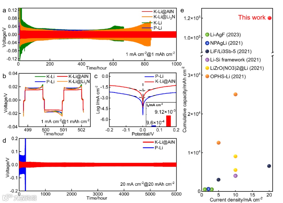 图4. 对称电池结构下的电化学性能。在1 mA cm−2@1 mAh cm−2下的a) 循环性能及b)放大电压曲线c) 对称K-Li@AlN和P-Li电池在10 mA cm−2@10 mAh cm−2下30个周期后的Tafel图。d) 对称P-Li和K - Li@AlN在20 mA cm−2@20 mAh cm−2时的循环性能。e) 锂锂对称电池性能对比