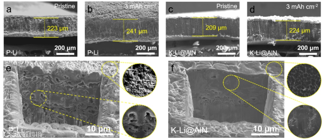 图5. 锂内部镀锂形态。a, b) P-Li和c, d) K-Li@AlN在镀3mAh cm−2前后的截面SEM图像。e) P-Li和f) K-Li@AlN电极在10 mA cm−2@10 mAh cm−2下循环50次后的截面FIB-SEM图像。