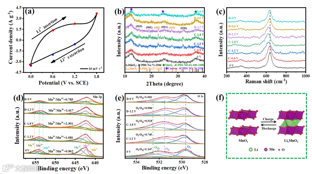 图3. MnO2@MBC在21 M LiTFSI “盐包水”电解液中(三电极体系)进行的充放电行为及其储能机理分析