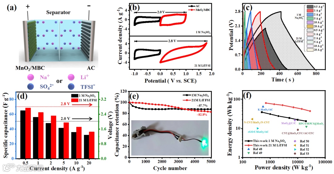 图2.分别以1 M Na2SO4和21 M LiTFSI为电解液的MnO2/MBC//AC不对称超级电容器及其电化学性能