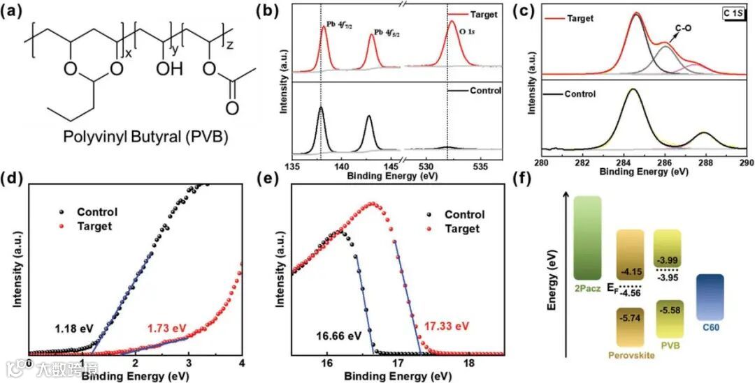 图1:a) PVB的分子结构。具有(目标)和不具有(对照)PVB 改性的钙钛矿薄膜的b) Pb 4f 和 O 1s 以及 c) C 1s XPS 光谱。d) 和 e) 含或不含 PVB 改性的钙钛矿薄膜的 UPS 光谱。f) PSCs的能级图。