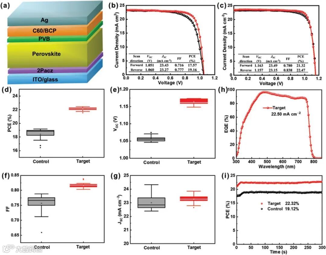 图2:a) 倒置 PSCs 的示意图。b) 对照和 c) 目标(有 PVB 修饰)PSC 的J-V曲线。有无PVB修饰的PSCs的d) PCE,e)Voc、f) FF 和 g)JSC统计图。h) PVB修饰后PSCs的 EQE 谱。i)有无PVB修饰的PSCs的稳态输出功率。