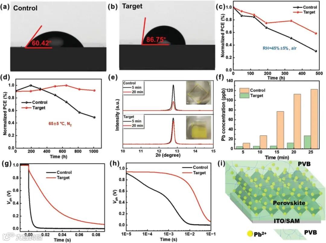 图4:a)对照和b)目标PSCs的接触角。PSCs的长期稳定性 c)储存在45%RH和25°C的空气中,d)在65±5°C的N中加热2无需外部封装。e) 在水中浸泡 5 分钟和 20 分钟后,具有(目标)和不具有(对照)PVB 的钙钛矿薄膜的 XRD 光谱。插图是将钙钛矿薄膜浸入水中 20 分钟后的对照和目标钙钛矿薄膜。f) 将含和不含 PVB 的钙钛矿薄膜浸入水中 25 分钟后泄漏的铅浓度。对照和目标 PSC 在前 0.1 秒内的 OCVD 动力学,以线性 g) 或对数 h) 时间坐标显示。i) PVB内部封装示意图。