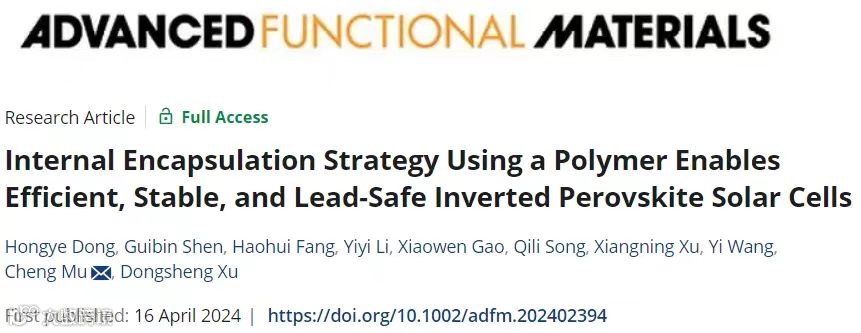 近日,来自中国人民大学的慕成课题组,在国际知名期刊Advanced Functional Materials上发表题为“Internal Encapsulation Strategy Using a Polymer Enables Efficient, Stable, and Lead-Safe Inverted Perovskite Solar Cells”的研究性文章。该文章针对目前钙钛矿太阳能电池存在的铅泄露和稳定性问题,提出了聚乙烯醇缩丁醛(PVB)对钙钛矿太阳能电池进行内封装的策略,同时对该内封装机理从离子迁移角度提出了解释。