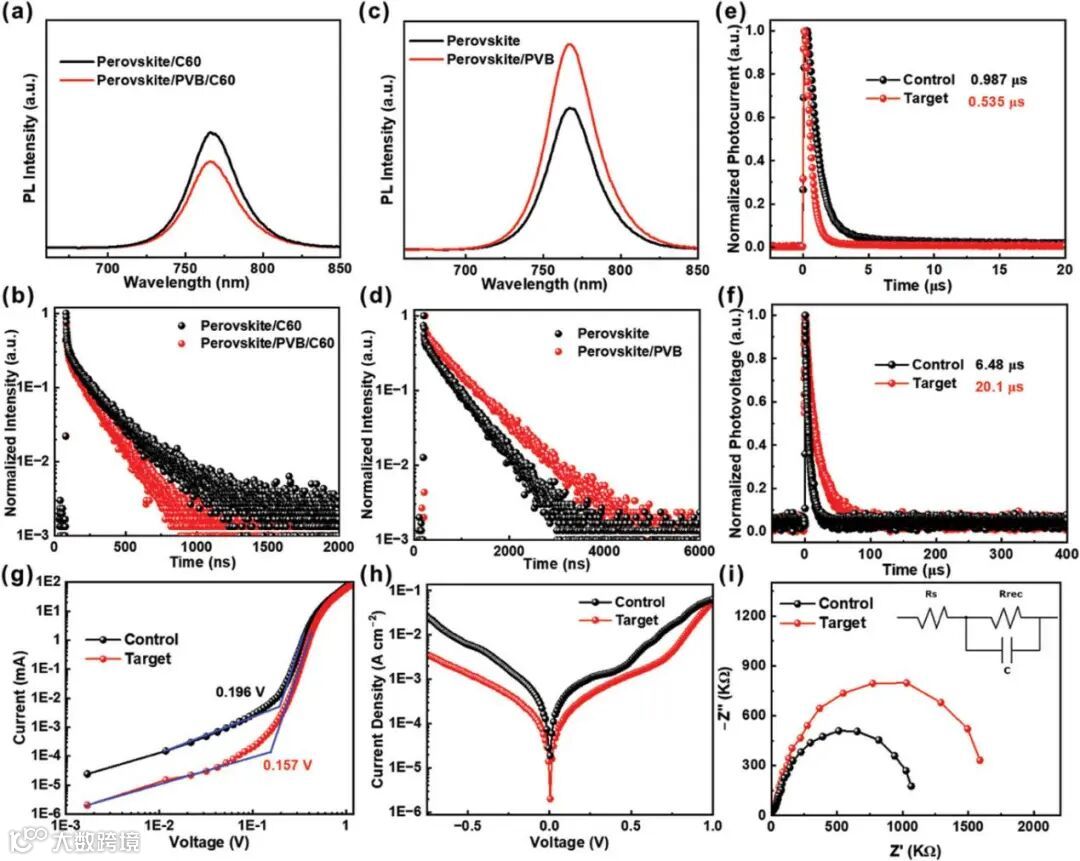 图3:a,c)PL(λex= 475 nm)和 b,d)TRPL光谱。对照和目标PSC的e)TPC和 f)TPV 衰减曲线。g)纯电子器件的SCLC 曲线。h)黑暗条件下J-V 曲线和 i)对照和目标PSC的尼奎斯特图(内部插图是等效电路图)