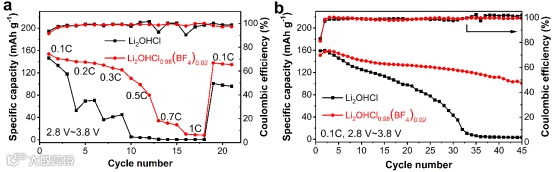 LiFePO4//Li2OHCl0.98(BF4)0.02//Li全电池表现出了更好的倍率性能和循环性能。倍率性能的提升归因于掺杂BF4-后离子电导率的提升。使用Li2OHCl0.98(BF4)0.02装配的电池在0.1C下循环45次后具有66.7%的容量保持率,而使用Li2OHCl装配的电池在45次循环后仅剩下2.2%的容量,后者快速的容量衰减可归因于Li2OHCl较低的离子电导率和对锂金属较差的电化学稳定性。