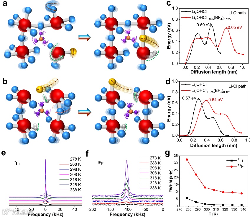 图3 CI-NEB模拟Li2OHCl0.875(BF4)0.125中锂离子沿(a)Li-O和(b)Li-Cl路径的传输轨迹示意图。红色、蓝色、金色、灰色、紫色和橙色球体分别表示O、未追踪的Li、追踪的Li,H、F和B。(c)Li-O和(d)Li-Cl路径上,Li2OHCl0.875(BF4)0.125和Li2OHCl能量图景。(e)7Li和(f)19F与温度相关的静态NMR谱。(g)7Li和19F不同温度下的半峰宽。