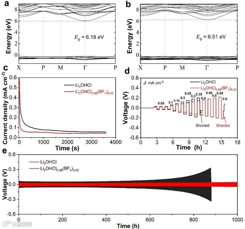 图4 (a)Li2OHCl和(b)Li2OHCl0.875(BF4)0.125的能带结构。(c)电子电导率测试(d)极限电流密度。(e)Li2OHCl和Li2OHCl0.98(BF4)0.02的Li//Li对称电池循环。