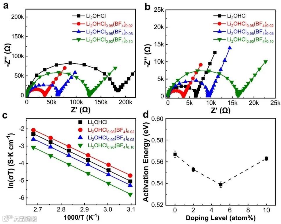 图2 (a)室温和(b)50℃下,Li2OHCl1-x(BF4)x(x=0、0.02、0.05和0.1)的电化学阻抗谱。(c)阿伦尼乌兹曲线和(d)Li2OHCl1-x(BF4)x(x=0、0.02、0.05和0.1)的活化能。