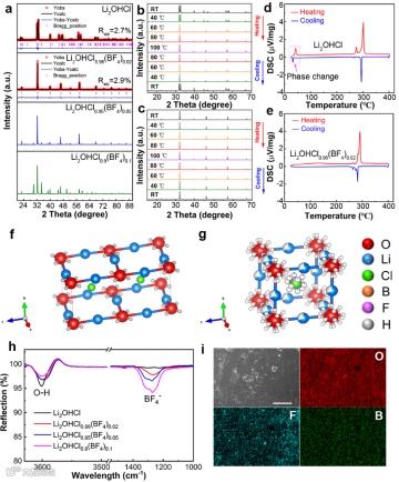 图1 (a)室温下Li2OHCl1-x(BF4)x(x=0、0.02、0.05和0.1)的PXRD。(b)Li2OHCl和(c)Li2OHCl0.98(BF4)0.02不同温度下的PXRD。(d)Li2OHCl和(e)Li2OHCl0.98(BF4)0.02的DSC曲线。(f)Li2OHCl和(g)Li2OHCl0.98(BF4)0.02的晶体结构。(h)Li2OHCl1-x(BF4)x的FTIR光谱。(i)EDS元素分布图,比例尺为50 μm。