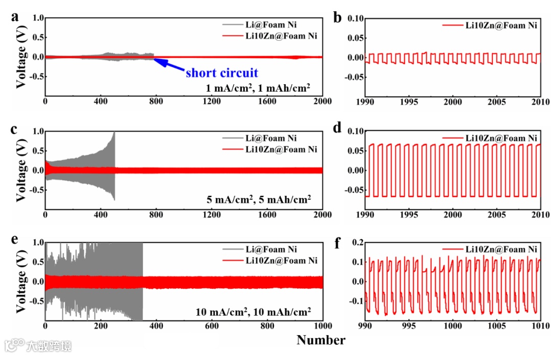 将Li10Zn@Ni复合负极组装为对称电池, 可以观察到Li10Zn@Ni电池的循环寿命是远高于Li@Ni电池的,尤其在大电流密度下的表现尤为抢眼。这都归因于双层分级骨架结构提供了大量有效的容锂空间,同时锂锌合金自身超高的Li+扩散率可以快速传输积累的Li+流量,避免Li+堆积产生尖端效应,进而减缓了锂枝晶和死锂的形成。