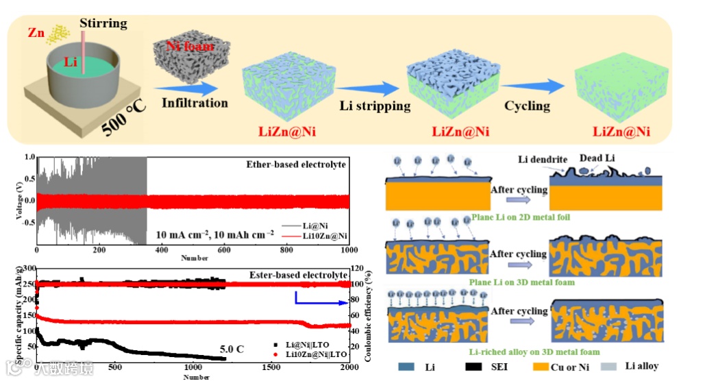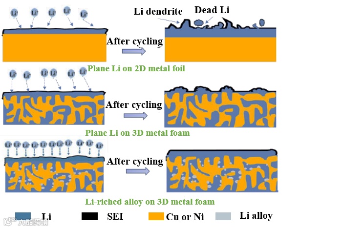 图7 .三种电极,纯锂,Li@Ni和Li10Zn@Ni电极的沉积剥离原理示意图。如前言所述,纯锂在长时间的循环后会形成枝晶和死锂,如果引入三维骨架可以降低局部电流密度,减缓枝晶生长,但是大骨架内部的沉积环境仍然和纯理类似。本文在金属泡沫网内部,原位引入第二层合金骨架,改善泡沫网内部的沉积环境,实现了锂的均匀、极少膨胀、无枝晶沉积。