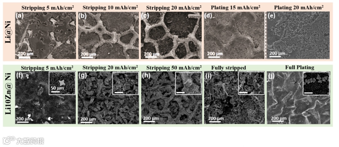 从对Li10Zn@Ni和Li@Ni电极剥离5, 10, 20 mAh cm-2和电镀15和20 mAh cm-2过程中的SEM图片变化可以发现,Li10Zn@Ni随着剥离深度的增加,泡沫镍的骨架逐渐暴露出来,而之后重新沉积20 mAh cm-2的锂之后,其表面又恢复了原始的平整致密状态。反观对比样Li@Ni,再次沉积之后的表面长出了很多锂枝晶。