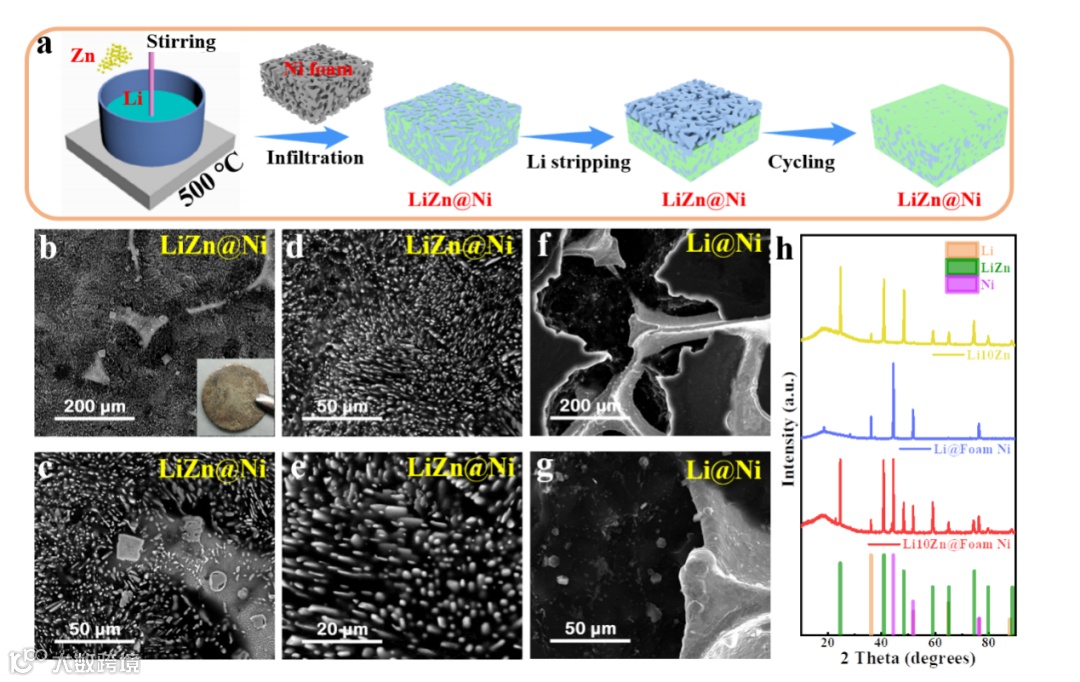 复合电极的制备过程如下:称取一定量的锂粒和金属粒在一定温度下熔融之后,将清洗后的泡沫镍或者泡沫铜侵入其中,随后拿出来冷却即可制备复合锂合金负极。由SEM图谱中可以看到,锂锌合金以块状链接大量松针的形式存在并均匀地分布在泡沫镍的骨架上,而纯锂则是非常致密地填充在泡沫镍的空隙间。从XRD图谱中也可以明显发现Li10Zn合金的出现,证明了复合电极的成功制备。