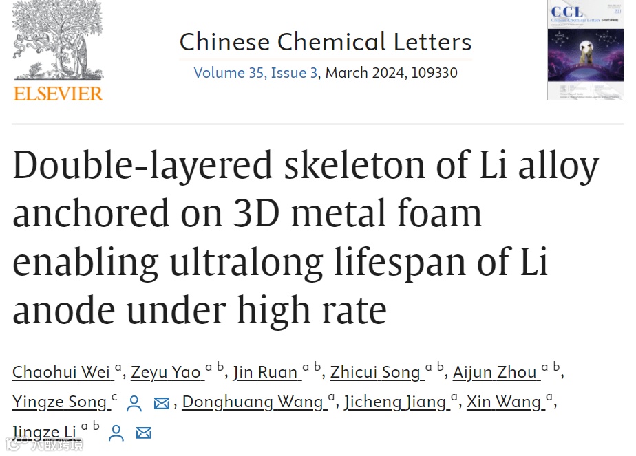 近日,来自电子科技大学的李晶泽教授和西南科技大学的宋英泽教授合作在国际知名期刊Chinese Chemical Letters上发表题为“Double-layered skeleton of Li alloy anchored on 3D metal foam enabling ultralong lifespan of Li anode under high rate”的研究文章。该观点文章介绍了一种双层分级骨架结构的锂合金,实现了高倍率、无枝晶的高性能锂金属电池。