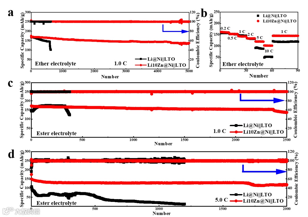 将Li10Zn@Ni符合负极和钛酸锂(LTO)匹配为全电池后,在醚类和酯类电解液下,进行长循环和倍率测试。可以发现,Li10Zn@Ni||LTO全电池性能优异,在酯类电解液中以5C的电流密度下,可以保持长达2000圈的有效循环。