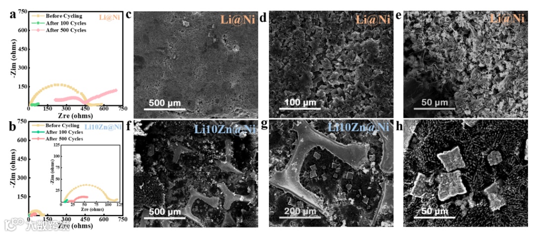 从电化学阻抗谱图中可以看到,循环后的Li10Zn@Ni电极电阻增长幅度较小,相比于Li@Ni。Li@Ni电极的表面在循环后生出了很多死锂和枝晶,而Li10Zn@Ni在循环后依然可以维持和原始状态较为相似的形貌。
