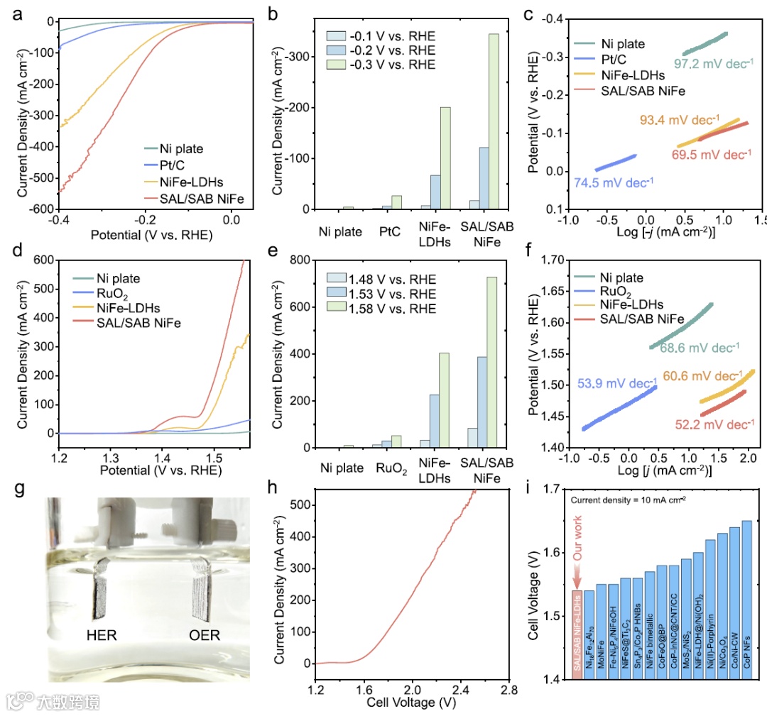 图4. 超亲气/超疏气NiFe电极的电解水性能。