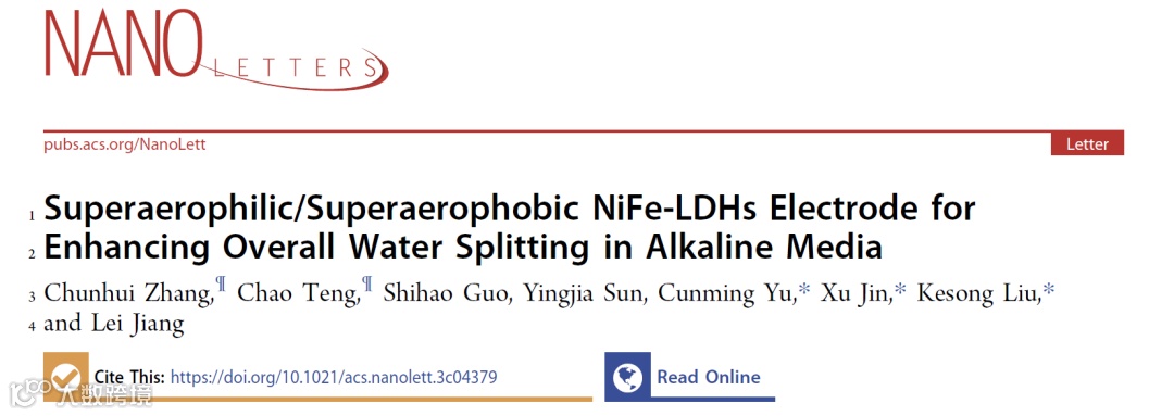 近日,来自北京航空航天大学的于存明副教授、刘克松教授与中国石油勘探开发研究院的金旭教授合作,在国际知名期刊Nano Letters上发表题为“Superaerophilic/superaerophobic NiFe-LDHs electrode for enhancing overall water splitting in alkaline media”的研究论文。在这项工作中,作者通过在镍表面构筑超亲气条纹涂层及双功能超疏气NiFe-LDHs催化剂,同时实现了高效氢/氧气泡及溶解氢/氧分子的高效传质,提升了电解水效率。