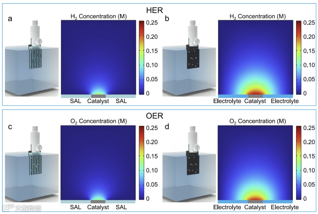 由于超亲气条纹表面气膜与大气连同,电极界面富集的溶解氢/氧分子可通过该气膜扩散至大气,显著降低了溶解氢/氧分子在电解液体相的扩散距离,进而提升扩散效率。作者通过有限元模拟对比了超亲气条纹引入与否对电极界面溶解氢/氧浓度的影响,发现超亲气条纹的引入可以显著降低电极界面溶解氢/氧分子的浓度,减小浓差极化过电位,提升电解水效率。
