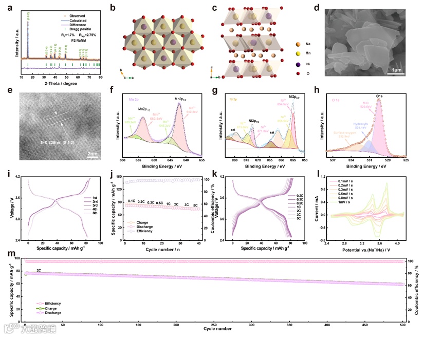 在潮湿的环境中,层状氧化物中的Na+会从晶格中脱嵌,与空气中的水和二氧化碳发生反应生产Na2CO3,NaOH等;同时,水分子会嵌入晶格中对晶体结构造成破坏,从而诱发裂纹的产生并导致材料失效,所以层状氧化物正极材料的水稳定性一直是亟待解决的难题。如图5a-d所示,本工作所报道的纳米薄层状Na2/3Ni1/3Mn2/3O2材料表现出卓越的水稳定性,经水处理10分钟后,XRD测试及精修结果显示其晶体结构保持完整,表明材料是本征稳定的。并且,水处理后的材料表现出5C电流密度下80.6%的倍率性能,以及2C电流密度下500周循环后高达79.6%的容量保持率。