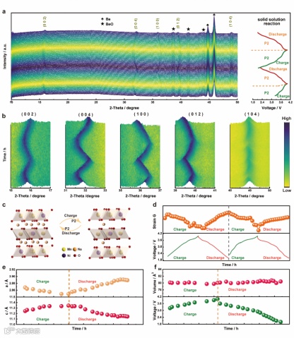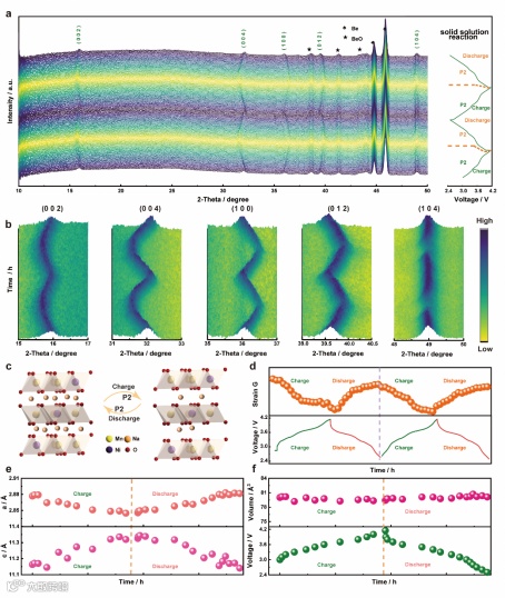 对于传统P2型Na2/3Ni1/3Mn2/3O2正极材料,为了提高电化学过程中材料的结构稳定性,从而获得更长的循环寿命,通常会将截止电压设定为2.5 V。本工作所制备的材料在2-4 V的电压区间,依然表现出平滑的充放电曲线,以及84.5%的倍率性能和循环500圈后74.7%的容量保持率(图3)。同样,图4a中原位XRD结果表明材料在充放电过程中发生的是固溶体反应,此外,图4d中应力计算结果表明材料在前两周充放电过程中表现出较高的可逆性。图4e,f中原位XRD精修结果显示,材料在充放电过程中的体积变化仅为0.1%,为零应变特性。