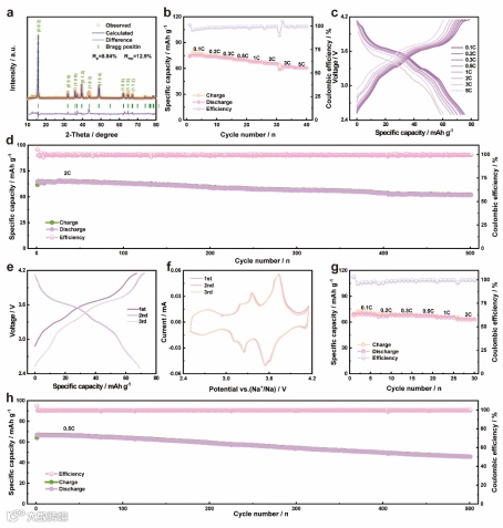 传统的有机溶剂(NMP)存在价格昂贵,有毒性等缺点,而水作为溶剂不仅能降低生产成本,也更加的环境友好。所以,解决层状氧化物正极材料应用水系粘结剂制备电极的难题,对其商业化应用具有极大的促进作用。本工作报道的正极材料表现出卓越的水稳定性,有望用来验证层状氧化物应用水系粘结剂制备电极的可行性。如图5e-h所示,以报道的纳米薄层状Na2/3Ni1/3Mn2/3O2和水系粘结剂为原料制备的电极,表现出优异的电化学性能,在0.5C电流密度下循环500圈以后,依然有68.4%的容量保持率。综上,本工作证明,水系粘结剂应用于层状氧化物正极材料电极的制备具有可行性。