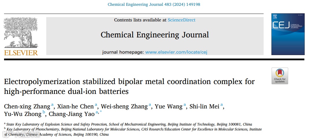 近日,北京理工大学姚长江课题组在国际知名期刊Chemical Engineering Journal上发表了一篇标题为“Electropolymerization Stabilized Bipolar Metal Coordination Complex for High-Performance Dual-Ion Batteries”的文章。该文章首次将含有三苯胺吡啶基配体的钴配合物通过电池内原位电聚合方法制备出无粘合剂的聚合物正极材料。聚(CoL)n电极在5A g-1大电流2000次循环后表现出超长循环性能,容量保持率高达89%。X射线光电子能谱(XPS)和傅里叶变换红外光谱(FTIR)结果表明,电聚合不仅可以解决溶解问题,而且可以延长体系π-π共轭结构,从而提高循环稳定性。此外,双离子机制有效提供了较高的比容量。本研究为利用电化学方法制备稳定的有机金属聚合物正极材料铺平了道路,并对其机理有了深入的研究。
