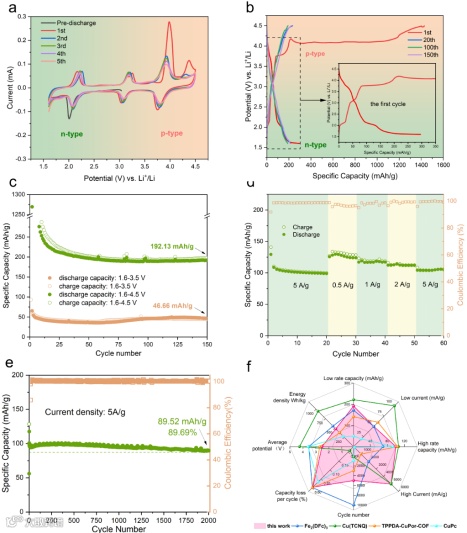 循环伏安曲线(图2a)显示出三对氧化还原峰和充放电曲线中的三个平台分别对应于锂离子插入和脱出三联吡啶部分和Co金属中心 (Co3+/Co2+)的氧化还原反应,以及有机配体中三苯胺基上自由基阴离子PF6-的可逆的插入和脱出。循环伏安图中首圈在4V处超高的氧化峰和充放电曲线中4.0V处出现的长充电平台,对应于初始充电过程中CoL的不可逆氧化聚合造成的。聚(CoL)n电极在循环稳定性、倍率能力、比容量方面表现优异,在循环寿命和能量密度(474 Wh kg-1)方面表现良好。在0.05Ag-1小电流密度条件下,经过150次循环后,放电比容量为192.13 mAh g-1,容量保持率为96.5%,对应于最大的9电子反应(图2c)。在5A g-1的大电流密度条件下,2000次循环后仍有89.52 mAh g-1的放电比容量,容量保持率为89.69%。