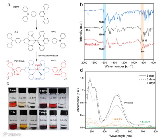 图1. (a)聚(CoL)n电极的合成(b) L、CoL和聚(CoL)n的FTIR光谱(c)原始聚(CoL)n阴极和循环聚(CoL)n阴极在不同电压范围(1.6-3.5V和1.6-4.5V)下浸泡不同时间的电解质的照片和(d)紫外可见光谱。