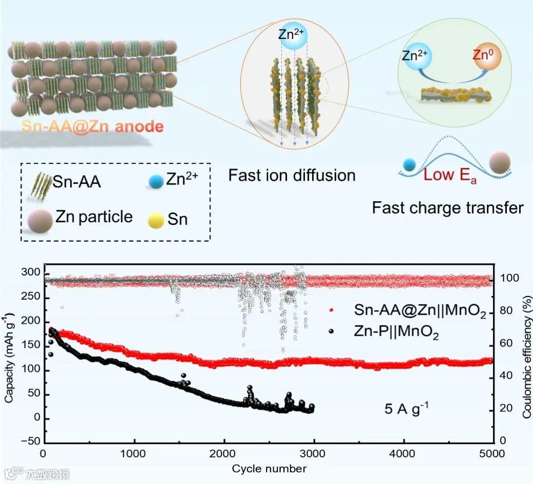近日,来北京航空航天大学的李彬副教授、李松梅教授等,在国际知名期刊AEnM上发表题为“Boosting Ion Diffusion and Charge Transfer by Zincophilic Accordion Arrays to achieve Ultrafast Aqueous Zinc Metal Batteries”的观点文章。该观点文章利用锌粉和具有丰富均匀分布的亲锌锡位的手风琴阵列纳米片(Sn-AA)构建了一种复合阳极,该阳极加速锌离子扩散和电荷转移,实现了高倍率下的水系锌金属电池稳定循环。