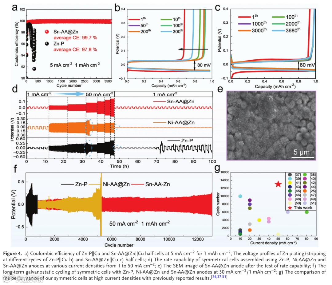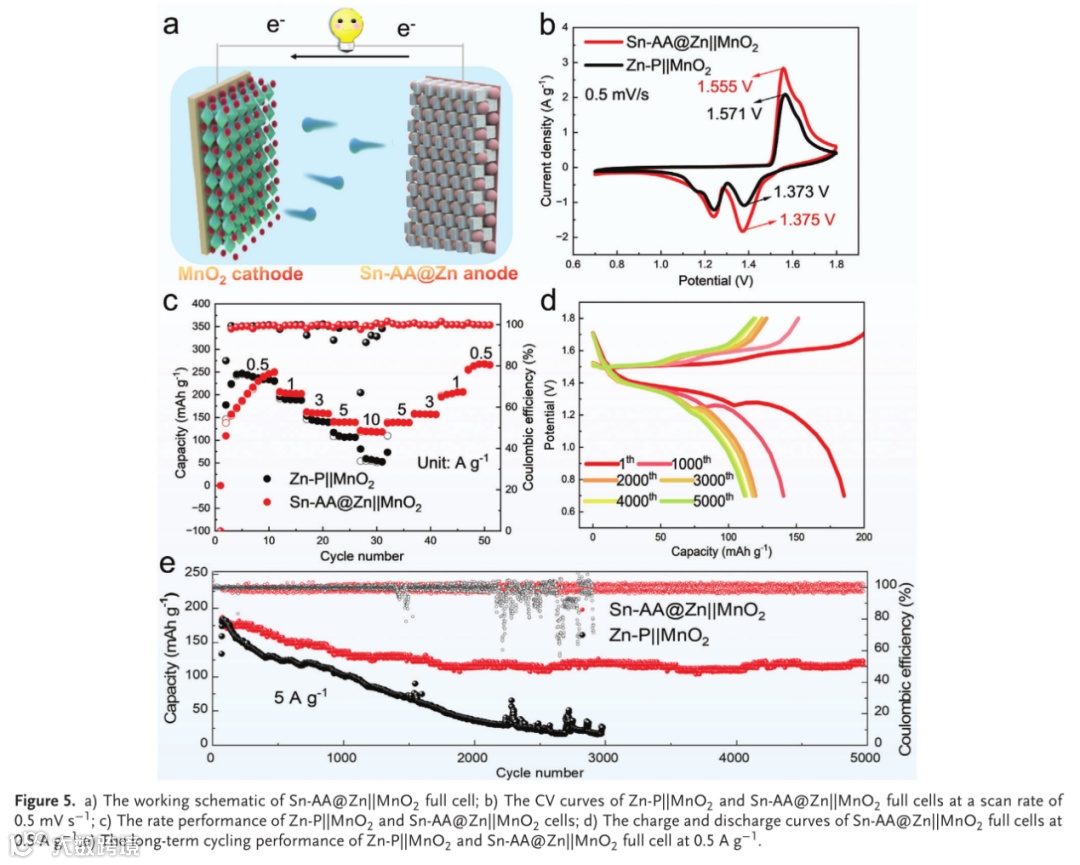 为了进一步揭示Sn-AA@Zn阳极的优势,组装SnAA@Zn||Cu半电池和Sn-AA@Zn||Sn-AA@Zn对称电池进行循环试验。3500次循环后,Sn-AA@Zn||Cu半电池保持99.7%的平均库伦效率。在50 mA cm−2的高电流密度循环中,Sn-AA@Zn||Sn-AA@Zn对称电池可以稳定循环>13000次,并且电压滞后稳定且低,这都归因于Sn-AA载体中快速的离子扩散和电荷转移。同时Sn-AA@Zn||MnO2全电池在5 A g−1的高倍率稳定循环5000次后可以保持125 mAh g−1的容量(每次循环的平均容量衰减仅为0.0065%)。
